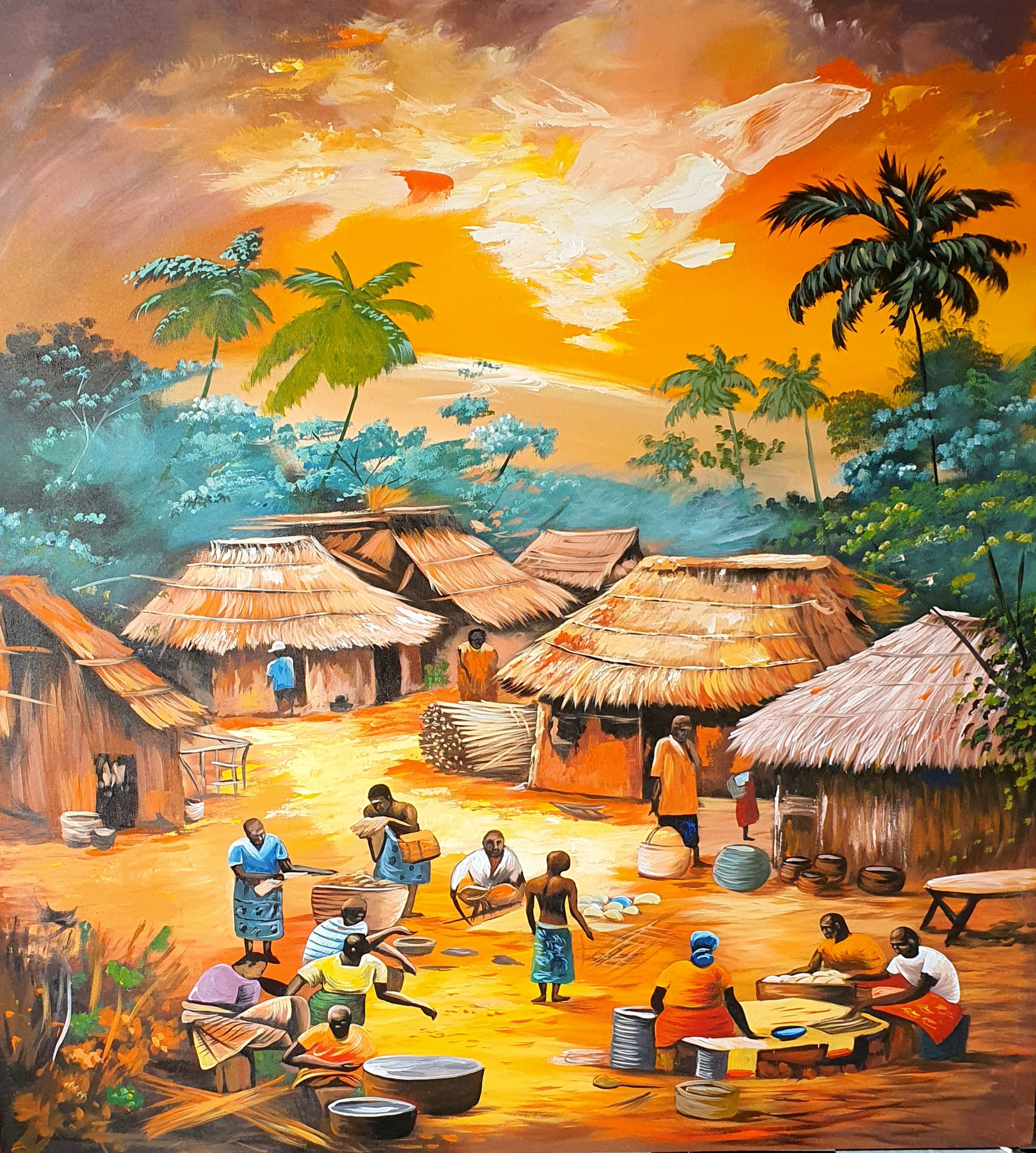 This vibrant abstract painting captures the dynamic spirit of a village where people are engaged in various forms of labor. Through bold colors and expressive forms, it conveys the energy and community inherent in daily work. Ideal for those who appreciate art that celebrates human effort and cultural vitality, this piece adds depth and movement to any space.